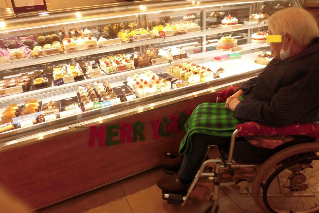 ご本人様にお好きなケーキを選んでいただきました。色とりどりのケーキを前に「どれも美味しそうやなあ」と悩まれていました。