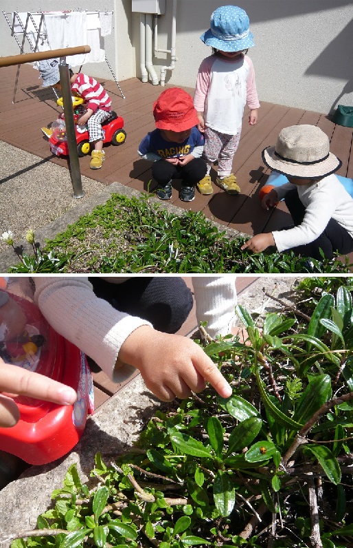「せんせー!きてー!」と呼ばれ、花壇前にいた子どもたちの元に行くと、「ほら!みて!」と指さす先にはてんとうむしが!春になったので園庭にも様々な生き物が遊びに来るようになりました。