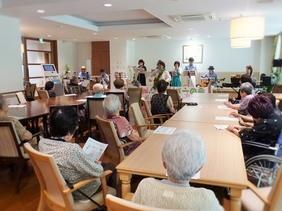 2019.7.26 ぽれぽれ学園前レジデンス クローバーの会コンサート≪ぽれぽれ学園前レジデンス≫ 9名の豪華な生バンドの演奏にフラダンスを披露していただきました。瀬戸の花嫁、ブルーハワイ、思い出の渚など14曲の懐かしい歌の数々。皆様どの曲もよくご存知で、楽しそうに口ずさんでおられました。(ぽれぽれ学園前レジデンス)