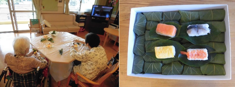 2021.7.23 ぽれぽれケアセンター白橿 柿の葉寿司≪ぽれぽれケアセンター白橿≫ 毎年恒例の柿の葉寿司をご利用者と一緒に作りました。鮭・鯖・海老・卵のネタを手際よく柿の葉に包んでおられました。夕食に「おいしいわあ」とたくさん召し上がってくださいました。(ぽれぽれケアセンター白橿)