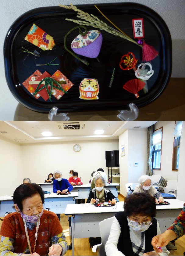 2021.12.22 ぽれぽれ学園前レジデンス お正月飾り≪ぽれぽれ学園前レジデンス≫ お盆に彩りや配置を考えながら飾りのパーツを貼り付けていきます。「どこに貼ろうかなぁ~」と見本を見ながら一つずつ貼って完成!にぎやかなお正月飾りになりました。(ぽれぽれ学園前レジデンス)