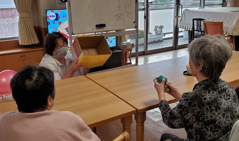 2022.2.3 ぽれぽれ登美ヶ丘 節分≪ぽれぽれ登美ケ丘≫ 節分と言うことで昼食に巻き寿司を召し上がって頂き、おやつに和菓子をお出ししました。豆の代わりの甘納豆もご用意しました。投げるのは、豆ではなくボールに替えて投げて頂きました。(ぽれぽれ登美ケ丘)