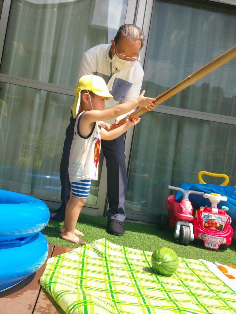 ご利用者が保育園の子どもたちとスイカ割りを楽しまれていました。