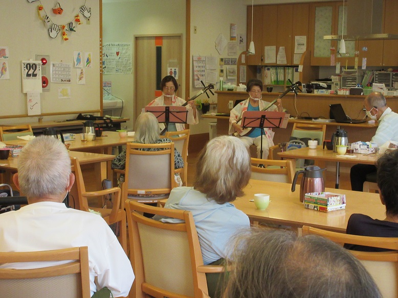 2025.9.23 ぽれぽれケアセンター白橿 楽しい民謡 誰もが知っている民謡と懐メロ、季節の唱歌を三味線の音色と共に楽しみました。 皆で手拍子しながら歌い、楽しい時間となりました。 (ぽれぽれケアセンター白橿 ディサービス・グループホーム)