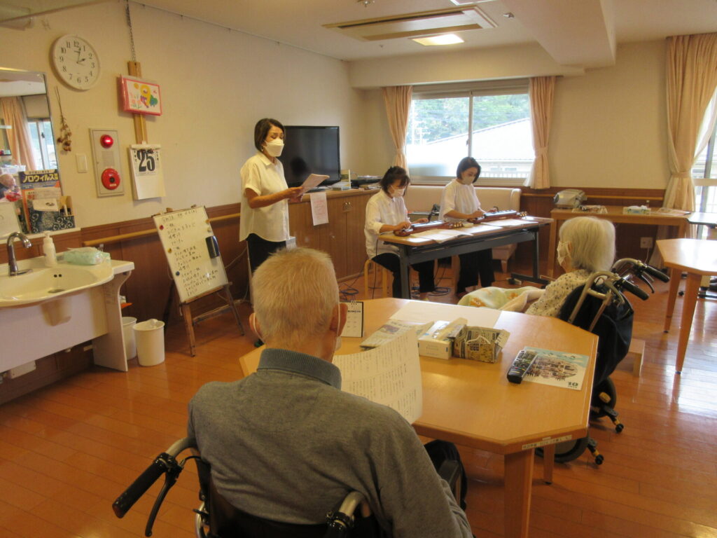 2025.9.27 ぽれぽれケアセンター白橿 大正琴演奏会 大正琴「陽だまり組」が大正琴の演奏と素敵な歌声を披露してくださいました 面会に来られた奥様がご主人様と一緒に歌を楽しむことができ、とても喜ばれました。 (ぽれぽれケアセンター白橿 特別養護老人ホーム)