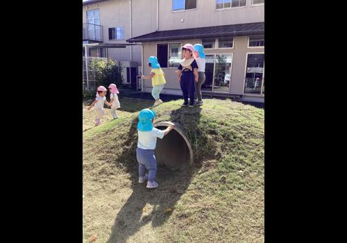 2025.10.24 ぽれぽれケアセンター白橿 お外遊び 毎日お外でめいっぱい遊ぶ子どもたちです。バッタやカマキリを見つけたり 築山でお友だちとヤッホー!と声を出して楽しそうです。 (ぽれぽれケアセンター白橿 ぽれぽれ保育園)