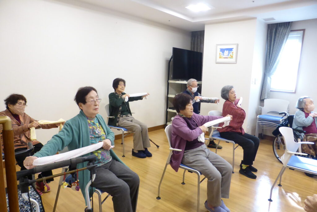 2025.10.29 ぽれぽれ学園前レジデンス ~タオル体操~ レジデンスでは毎日14時頃から 様々なアクティビティを開催しています。 その中のひとつがタオル体操。 タオルを使うことにより、少ない負担で バランスよく体幹や筋肉が鍛えられます。 (ぽれぽれ学園前レジデンス)