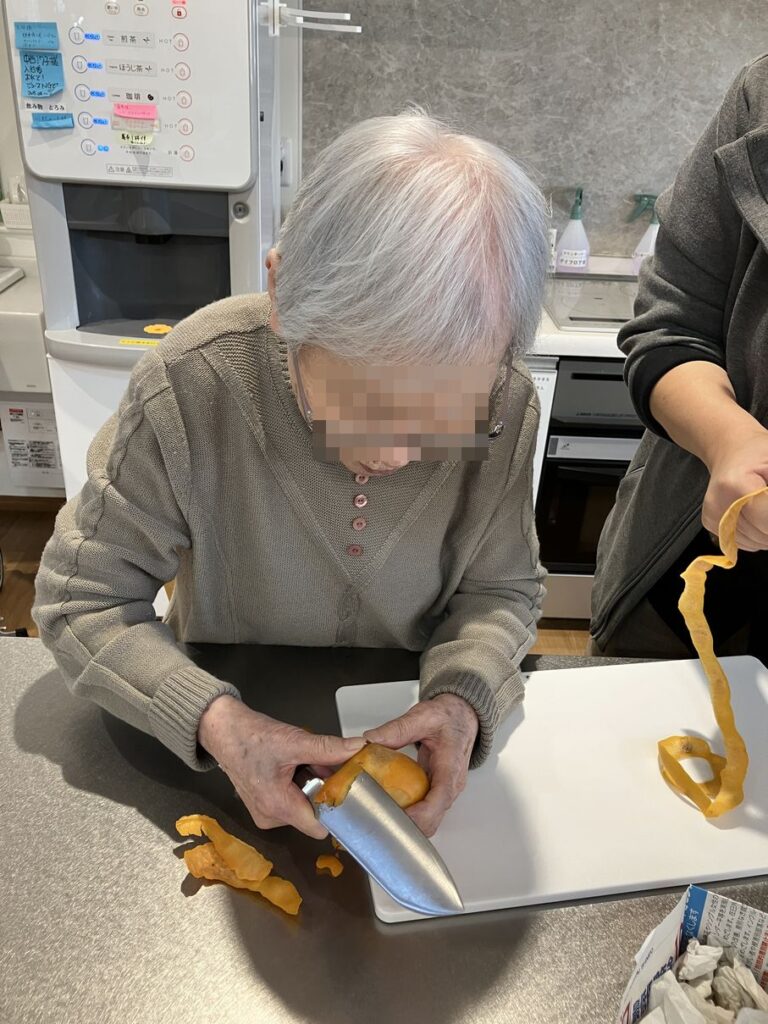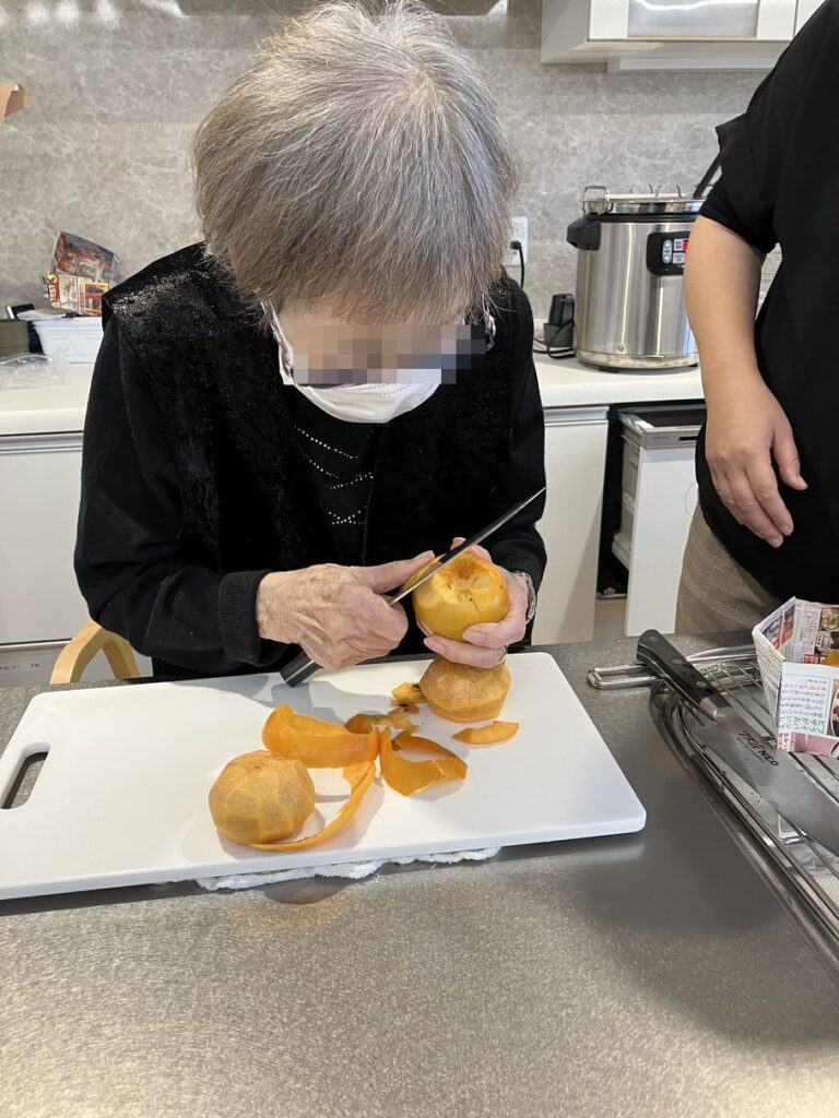2025.11.3 ぽれぽれケアセンター青山 「柿のおやつ」 職員のお家の畑にたくさんの柿ができていて、 おすそわけしてくれました。その柿をご利用者が剥いてくださり、 みなさんでおやつにいただきました。 (ぽれぽれケアセンター青山・デイサービス)