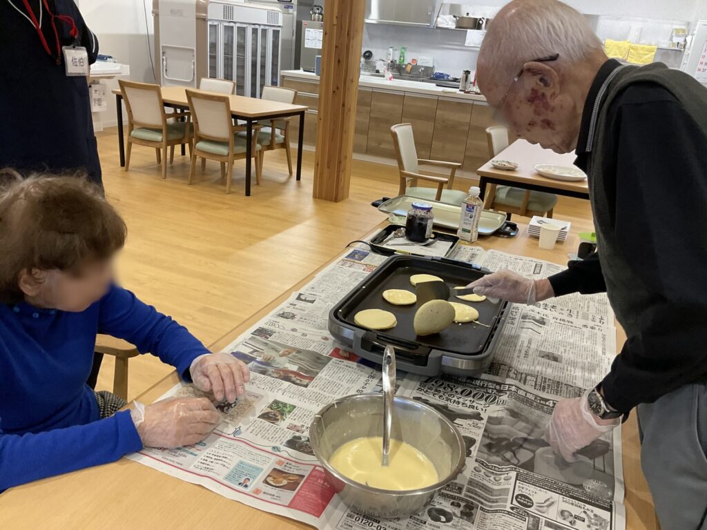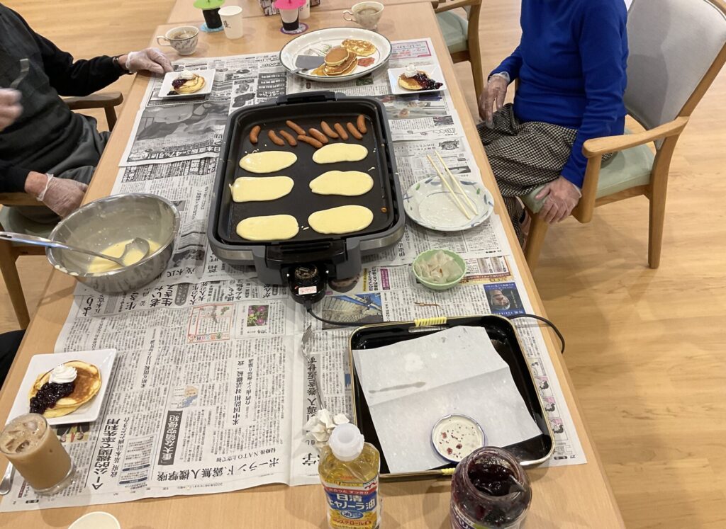2025.11.7 ぽれぽれ東登美ヶ丘 ホットプレート出しました! ホットプレートで初めてのおやつ作り。 玉子を割って粉と混ぜ、ウィンナーを切って焼いて貰い・・ 普段台所には立たないと仰る方もおられましたが 楽しそうに生地を焼き、「美味しい!」との声。 笑顔がこぼれ会話も弾んでました。 (ぽれぽれ東登美ヶ丘)