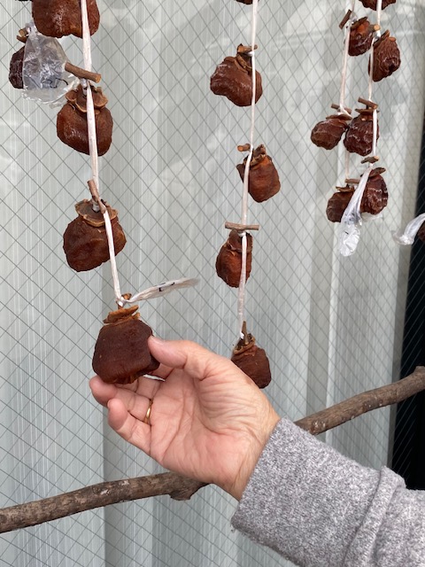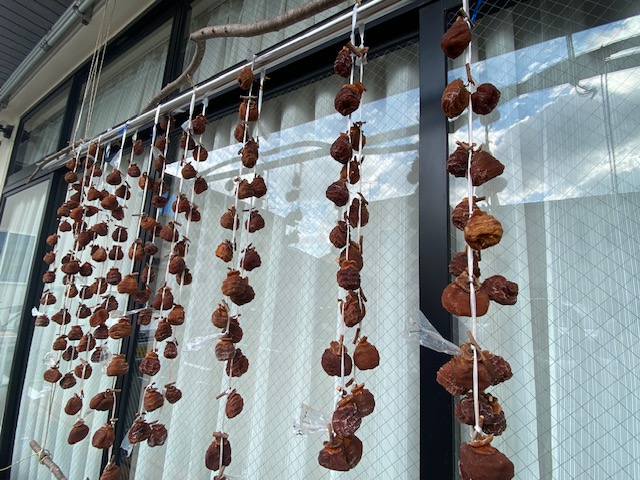 2025.11.18 ぽれぽれ四条大路 秋の風物詩【吊るし柿】 目でも秋を感じてもらいたいと思い、吊るし柿を施設の中庭に吊るしました。 「昔は良く、こうやって吊るしていたわ」と皆さま懐かしんでおられました。 (ぽれぽれ四条大路)