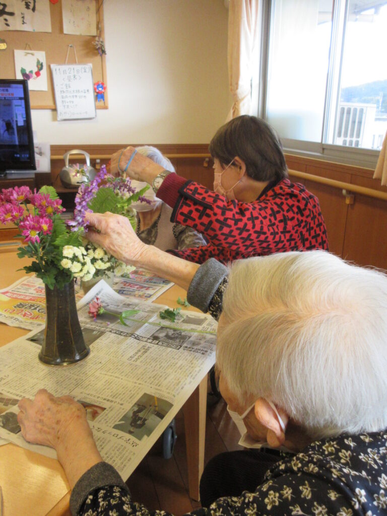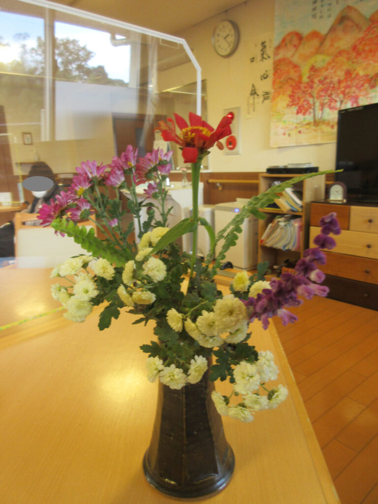 草月流の先生と一緒に生け花を楽しみました 白くて可愛い小菊と赤い百日草が