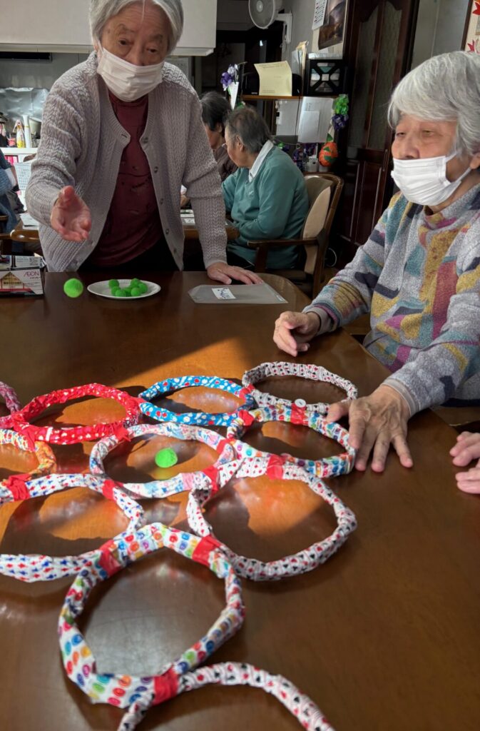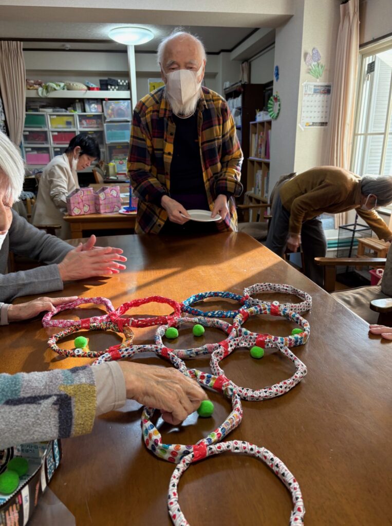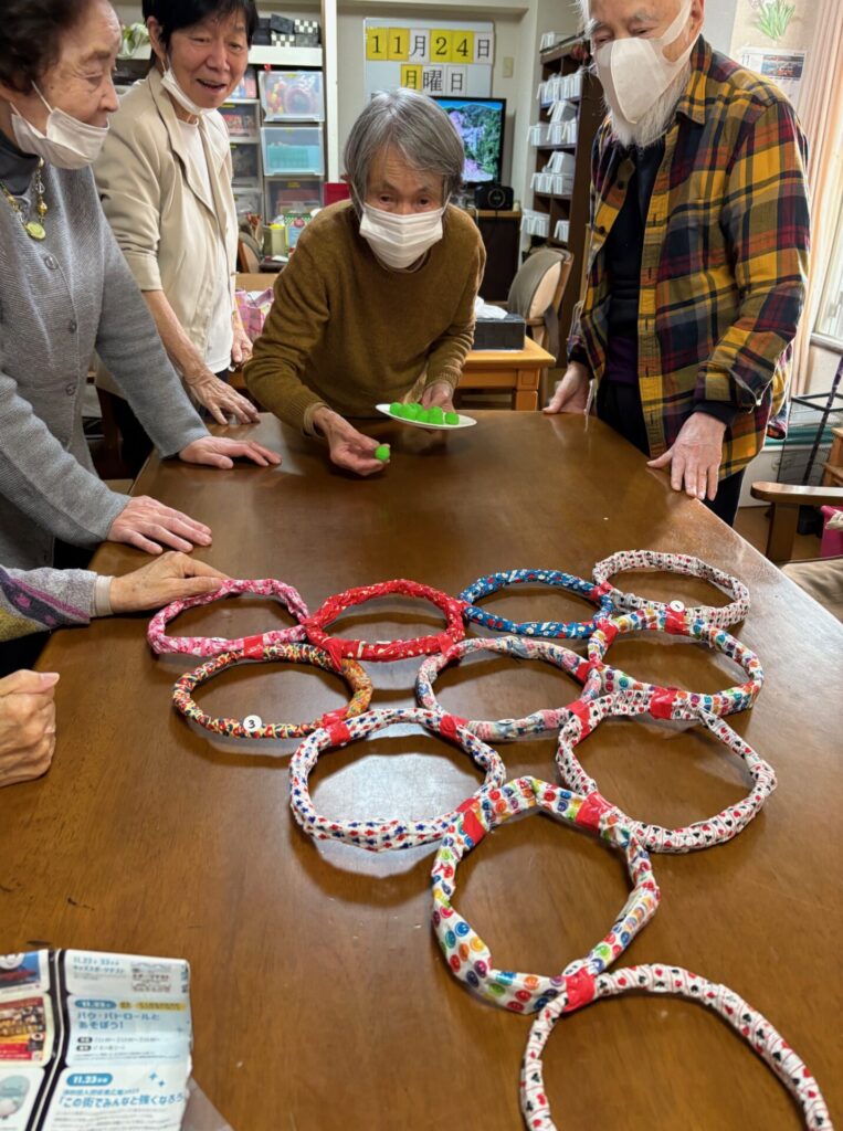 2025.11.25 ぽれぽれ中和 レクリエーションその2 レクリエーションその2はボール入れをしました。 輪っかの中にボールを上手く入れて点数を競うゲームですが 遠くの高得点を狙うご利用者が多くみられました。 (ぽれぽれ中和)