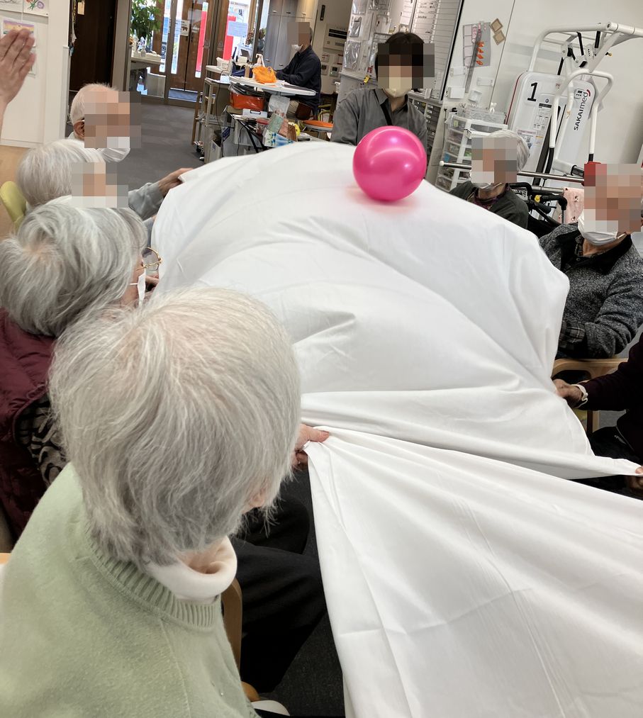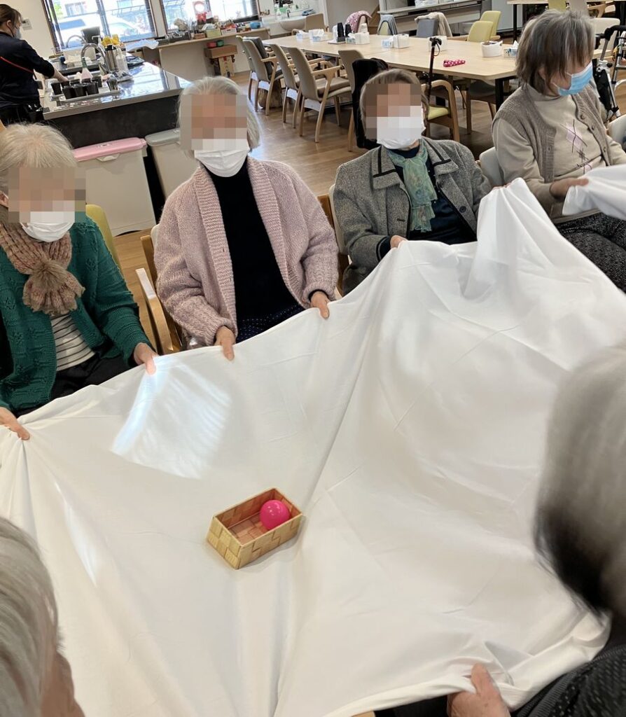 シーツの端を持って、上下に動かしボールを端から端へ運ぶゲームと