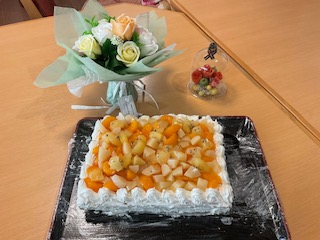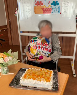 出来上がったケーキを囲んで、みんなでハッピバースデーの歌を合唱。主役のご利用さまもとても喜ばれ、あたたかい雰囲気の中でお祝いすることができました。