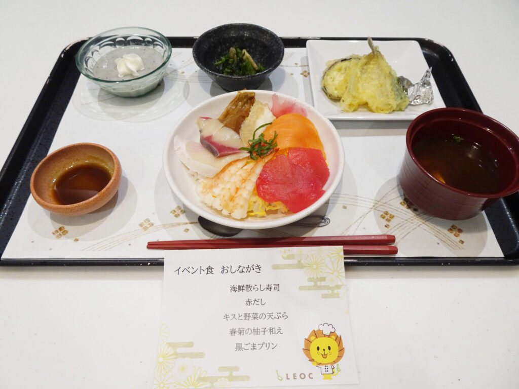 2025.12.16 ぽれぽれケアセンター青山 「イベント食」 本日のイベント食です。 海鮮散らし寿司、赤だし、キスと野菜の天ぷら、春菊の柚子和え、黒ごまプリンです。 沢山の方が喜んで、ほぼ残さず食べられていました。 (ぽれぽれケアセンター青山 有料老人ホーム)