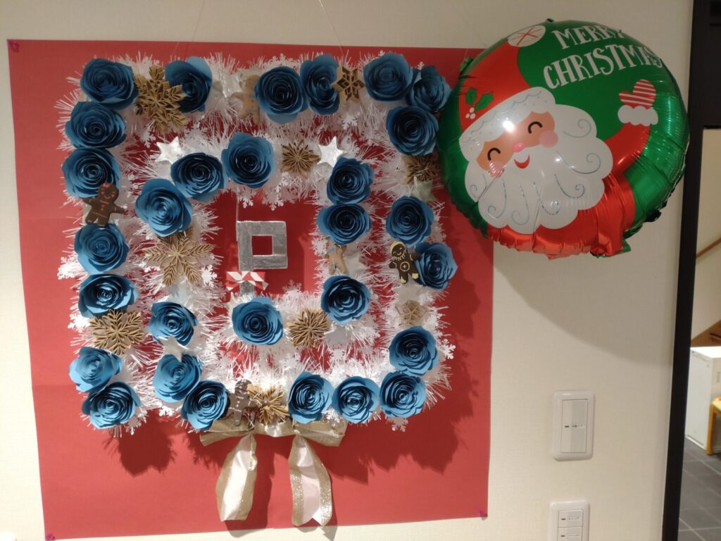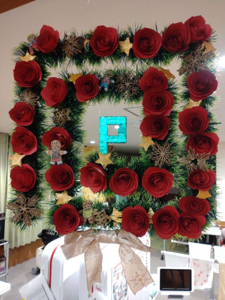 現在、約50cm四方の大型リースは、フロアを華やかに彩ってくれています。