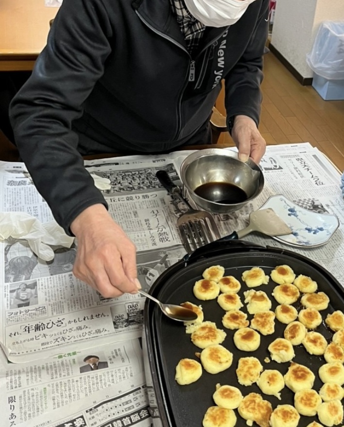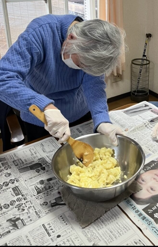 おやつに芋餅を作りました。ジャガイモに片栗粉を混ぜて焼き、