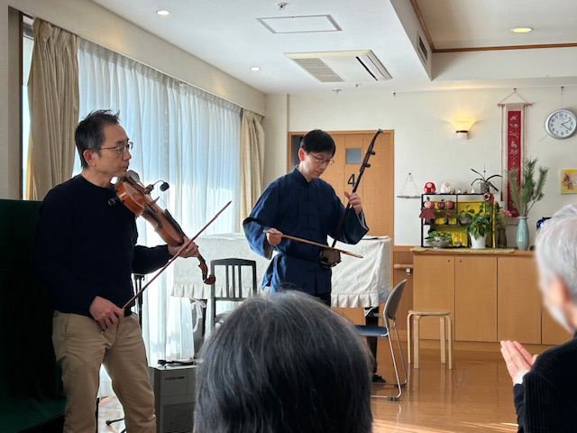 2026.1.24 ぽれぽれ登美ヶ丘 「二胡とバイオリンの演奏会~♪」 中国の楽器“二胡”と“バイオリン”の演奏ボランティアに 来て下さいました〜⭐️ 美しい音色と初めて見る楽器に引き込まれました〜♪ (ぽれぽれ登美ヶ丘)
