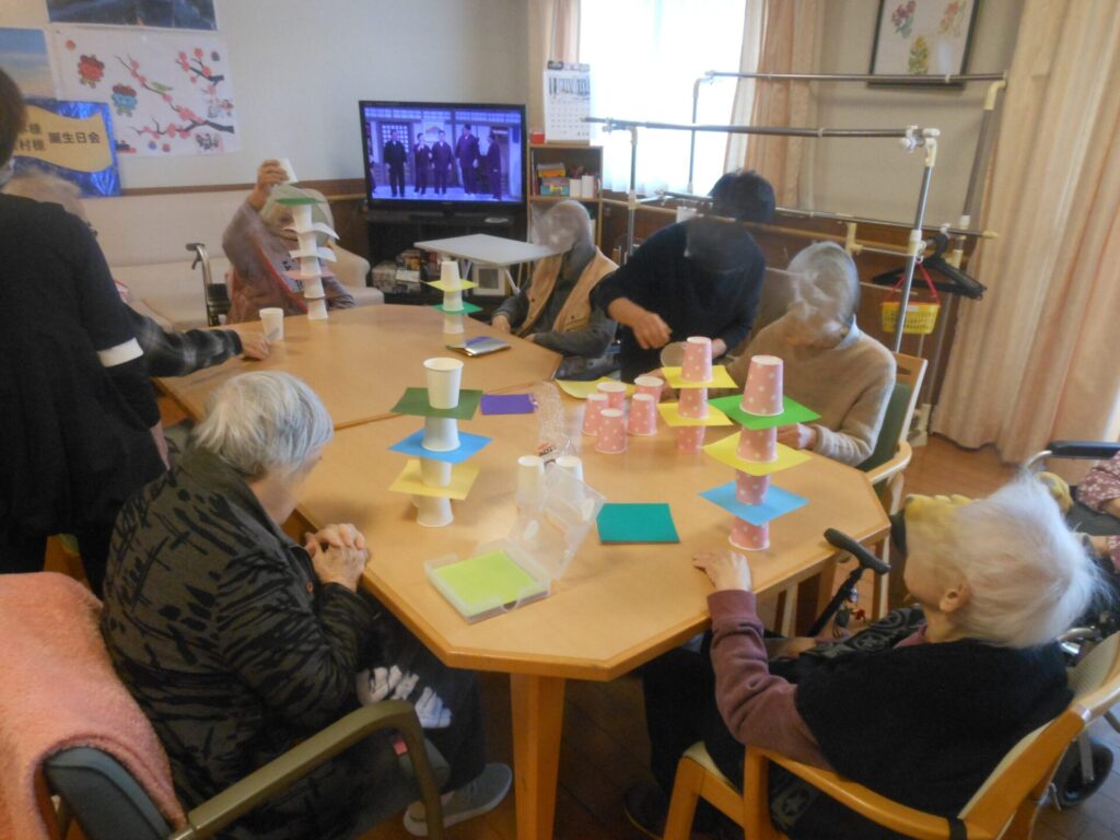 2026.2.3 ぽれぽれケアセンター白橿 紙コップタワー 一番高いタワーを作れるのは誰かと競うように高いタワーを作っておられました。頭と手の運動と思い始めましたが、車椅子から立ち上がってまで高い所を目指される方もおり思いのほか盛り上がっていただけました。 (ぽれぽれケアセンター白橿 特別養護老人ホーム)