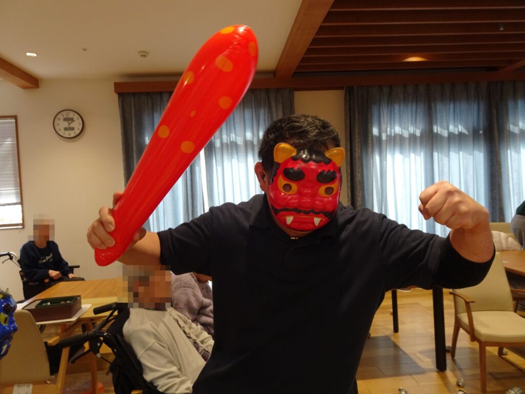 「鬼は外、福は内」という掛け声と共に、新聞紙で作った豆で鬼退治!!