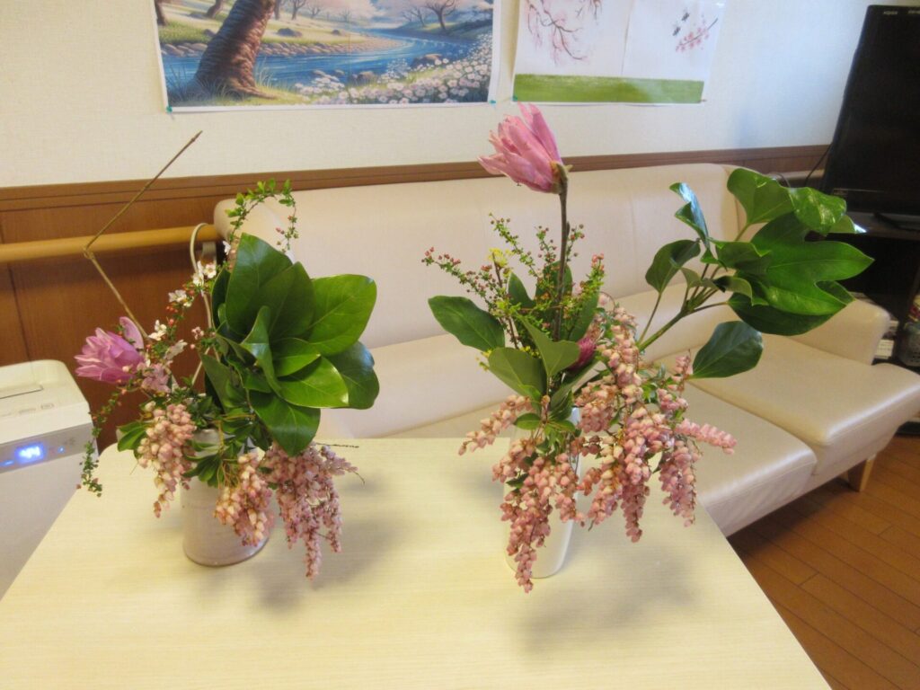 2026.3.23 ぽれぽれケアセンター白橿 生け花 草月流の先生方と一緒に生け花を楽しみました 花材はピンク色のゆきやなぎ、あせび、シデコブシと黄色いサンシュユ とても可愛い作品となりました (ぽれぽれケアセンター白橿・なごやかホーム)