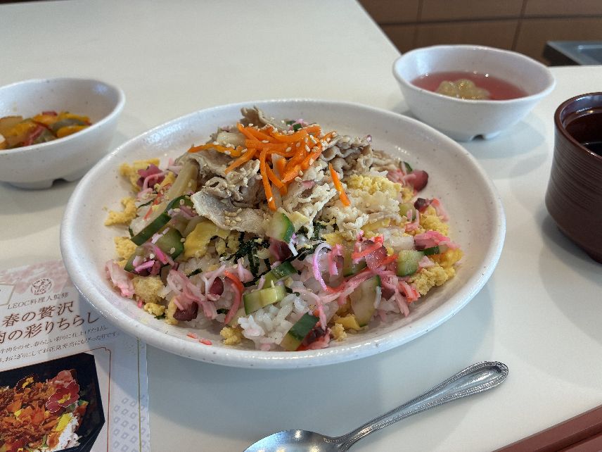 2026.4.20 ぽれぽれケアセンター青山 LEOC料理人監修のメニュー 春の贅沢 ・牛肉彩り散らし ・赤だし ・ピーマンのきんぴら ・デザート 春らしい彩りで美味しく召し上がられていました。 (ぽれぽれケアセンター青山・デイサービス)
